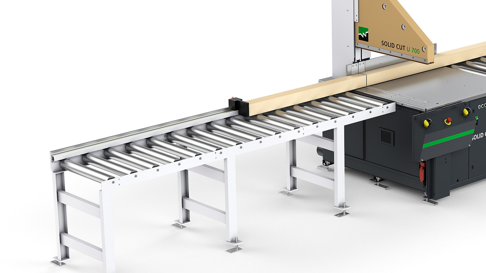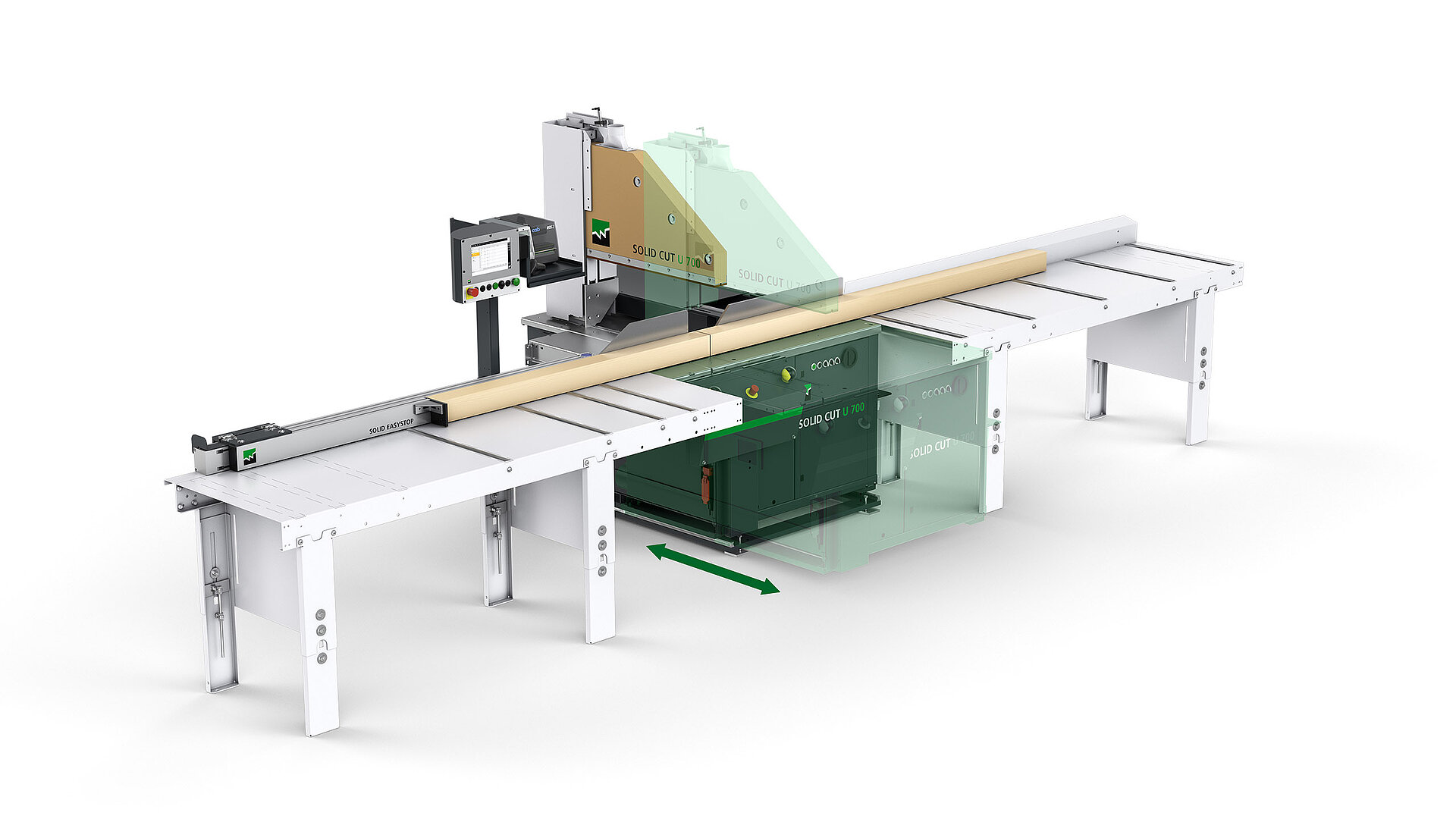 The SOLID CUT U 700 can be mounted on two linear guides. This allows it to be adjusted manually in depth and clamped pneumatically in any position. The cross-cut saw can be positioned to match the width of the wood. This optimizes the work cycle and reduces non-productive times to a minimum.