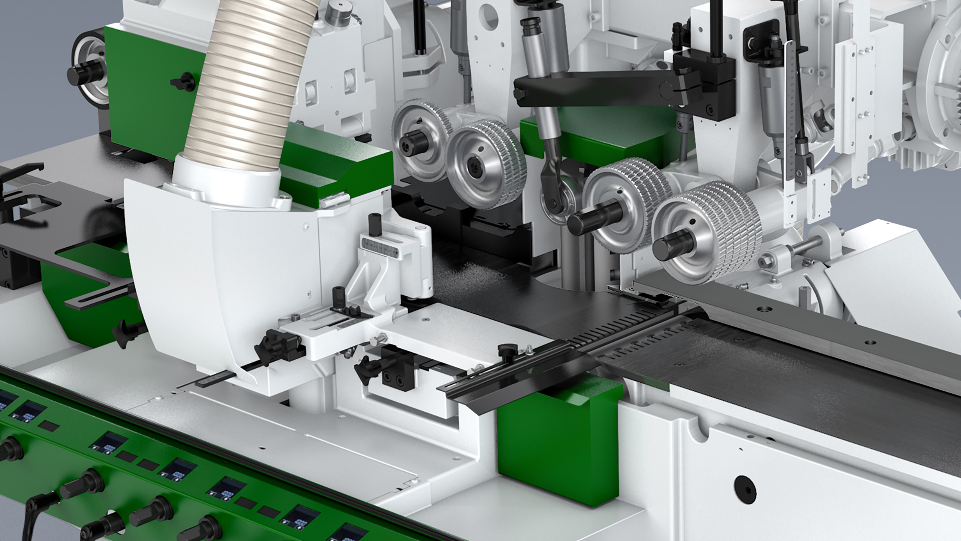Durch das optionale Sägepaket an der zweiten unteren Spindel wird der SOLID PROFILE P 500 zur Vielblattsäge. Dies ermöglicht das vierseitige Hobeln und Auftrennen in einem Arbeitsgang. Die Fangeinrichtung gewährleistet höchste Sicherheit für den Bediener.