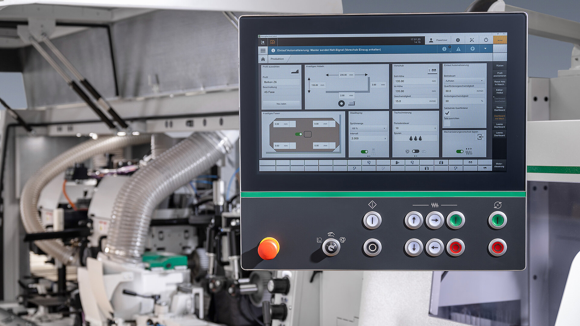 Die Kernfunktion von WMC ist das Dashboard, das dem Bediener eine umfassende Übersicht aller relevanten Leistungsdaten bietet. Der Bediener kann das Dashboard individuell an die Anforderungen seines Produktes anpassen, um alle wichtigen Informationen auf einen Blick zu haben. Das einfache User Interface ermöglicht kurze Einlernzeiten für neue Bediener. Der Funktionsumfang von WMC orientiert sich an den Kundenbedürfnissen, und die Steuerung kann je nach Anforderung um optionale Module, wie einen digitalen Wartungsplan, erweitert werden. Seit Anfang des Jahres ist WMC auch auf dem SOLID PROFILE P 700 verfügbar, was bedeutet, dass nun auch Handwerksbetriebe die Vorteile der komfortabelsten Steuerung für Kehlmaschinen am Markt genießen können.
